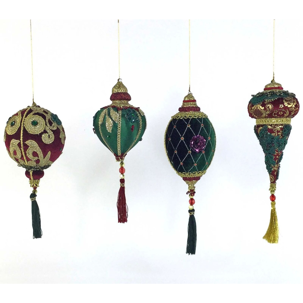 Transform your Christmas décor with the exquisite Winter Balsam and Berry 4-Piece Ornament Assortment from Katherine’s Collection. Each ornament is meticulously handcrafted from luxurious fabric, showcasing rich shades of deep red, green, and gold. They are adorned with intricate embroidery, sparkling crystals, and elegant tassel accents, ensuring they stand out during the festive season.