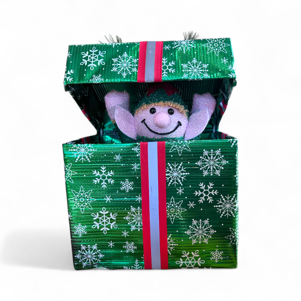 Has LED Lights and the Lid opens and shuts with the elf bobbing up and down.